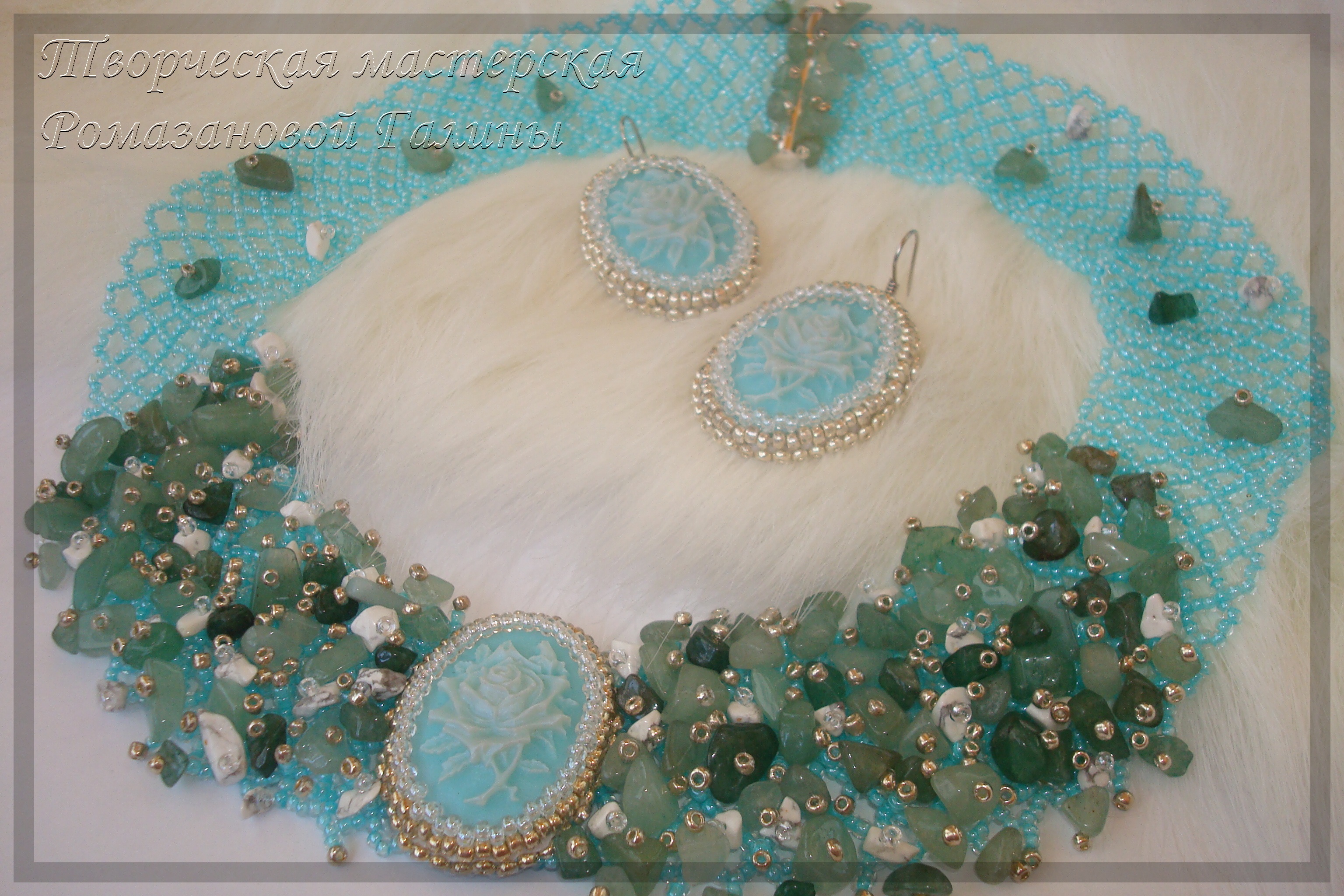 В украшении использованы искусственные камеи, чешский бисер Presiosa (10/0), китайский бисер Zlatka (10/0 ), сколы натуральных камней авантюрина, магнезита, замок-слайдер, металлические швензы.